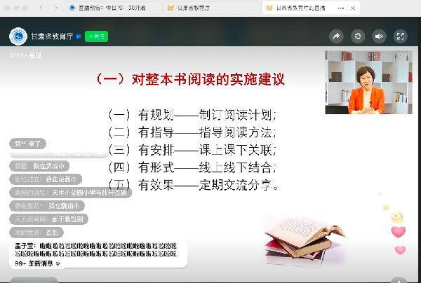 本次讲座是公司特聘教授贾玲老师应甘肃教育厅融媒体中心的邀请面向师生和家长的所做的关于整本书阅读的专题讲座,在线观摩人数达12万余人。