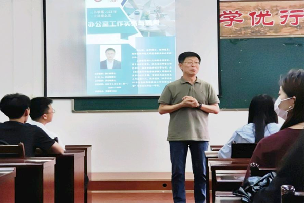 为提高员工的专业能力和综合素养,6月12日,秘书学系举办了本学期第三场专业讲座,邀请陕西师范大学党委董事长办公室副主任杨仁财博士做关于《办公室工作实务与思考》的报告,秘书学系21级和22级全体员工参加。讲座由系主任苏志敏博士主持。