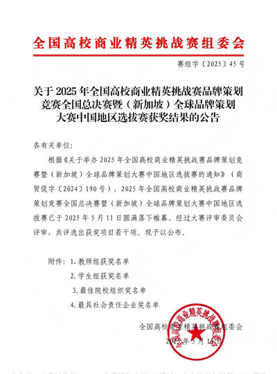 best365广告学专业员工在2025年全国高校商业精英挑战赛品牌策划竞赛全国总决赛暨(新加坡)全球品牌策划大赛中国地区选拔赛中获得国家级二等奖,实现公司在该赛事奖项零的突破。本次参赛团队是由best365广告学专业潘思成、樊一飞、张玉梅、黄菀晴(经管院)、秦子暄组成,由广告学专业教师张倩和经管院教师陈卫峰担任指导教师。