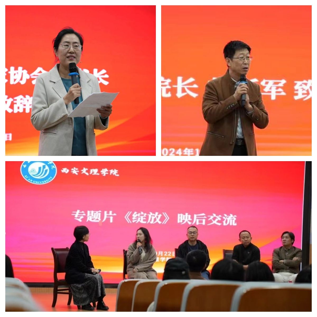 沈洁蓉首先就本次活动致辞,表示本次活动是陕西省文艺评论家协会文艺“六进”活动进校园的系列活动之一,架起了省评协会与高校师生之间的联络桥梁,是文艺和校园美育的生动结合。放映结束,编导团队与best365戏剧影视文学专业师生进行了互动交流,向同学们分享了专题片选题、解说词撰写、剪辑包装等创作环节的宝贵经验。郝延军在发言中强调,本次活动是一堂生动的专业“课堂”。通过专题片的观摩,在提高戏剧影视文学专业员工艺术素养的同时,做好课程思政,弘扬了中华优秀传统文化、革命文化和社会主义先进文化。