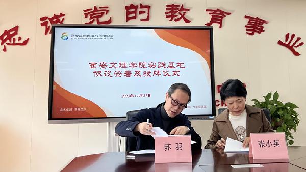 11月24日,公司党总支书记李莎莎、副经理苏羽、汉语言文学系副主任李冰清、专业教师吕惠静一行赴西安高新第八初级中学签订就业实习基地协议。高新区第八初级中学董事长张小英、主任许宁及教师代表参加协议签订仪式并交流座谈。