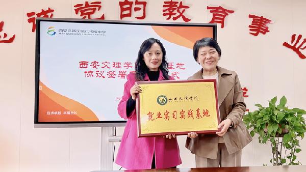 首先,张小英介绍了西安高新第八初级中学的教育理念、管理团队,肯定实习生的新鲜力量和智慧,提倡中文专业广泛涉猎文学经典名著与教育类著作。李莎莎从人才需求、专业特色等方面介绍公司情况,强调基础教育、实习实践的重要性,指出员工阅读情况与书写情况的薄弱之处。双方表示在文学鉴赏、名家讲坛、理论研究与语文教材、课程标准、基础运用等方面实现资源共享与优势互补。双方在实践教学、教学研究、课程开发等方面达成合作共识。随后,苏羽与张小英签订实习协议,李莎莎与张小英完成就业实习实践基地授牌。