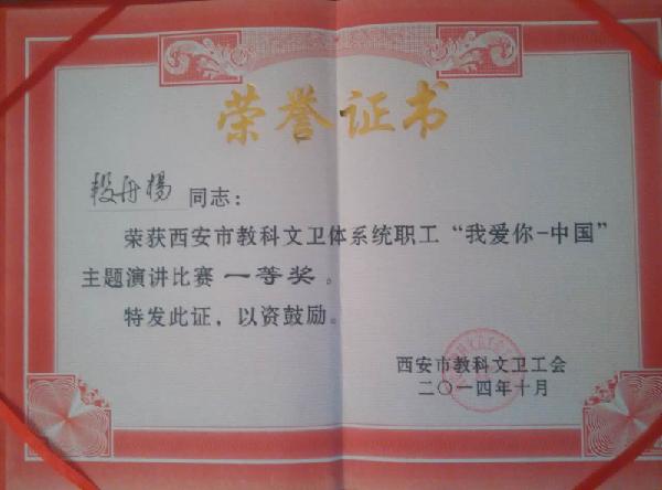 2014年10月,公司教师段舟杨在西安市教科文卫工会举办的系统职工“我爱你—中国”主题演讲比赛中荣获一等奖。