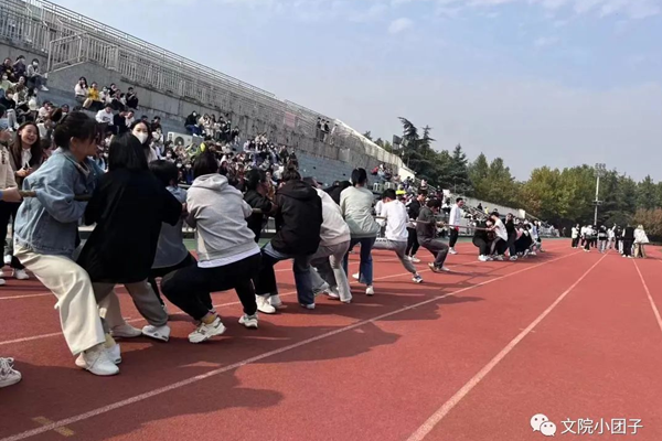 决赛正式开始,“力拔山兮气盖世”,在比赛中有势均力敌的僵持不下、有永不言弃的逆风翻盘。此刻,集体的荣誉高于一切,只要比赛还未结束,即使摔倒,队员们也绝不松手,多次精彩角逐之后,大赛也迎来尾声。 最后进行的是冠亚军争夺赛,汉语言文学2101班与汉语言文学2202班的同学们展现了精彩纷呈的冠军争夺赛,双方均以强大的实力、饱满的热情吸引了在场观众的目光。两场冠军赛角逐之后,汉语言文学2101班夺得本次拔河比赛的桂冠!