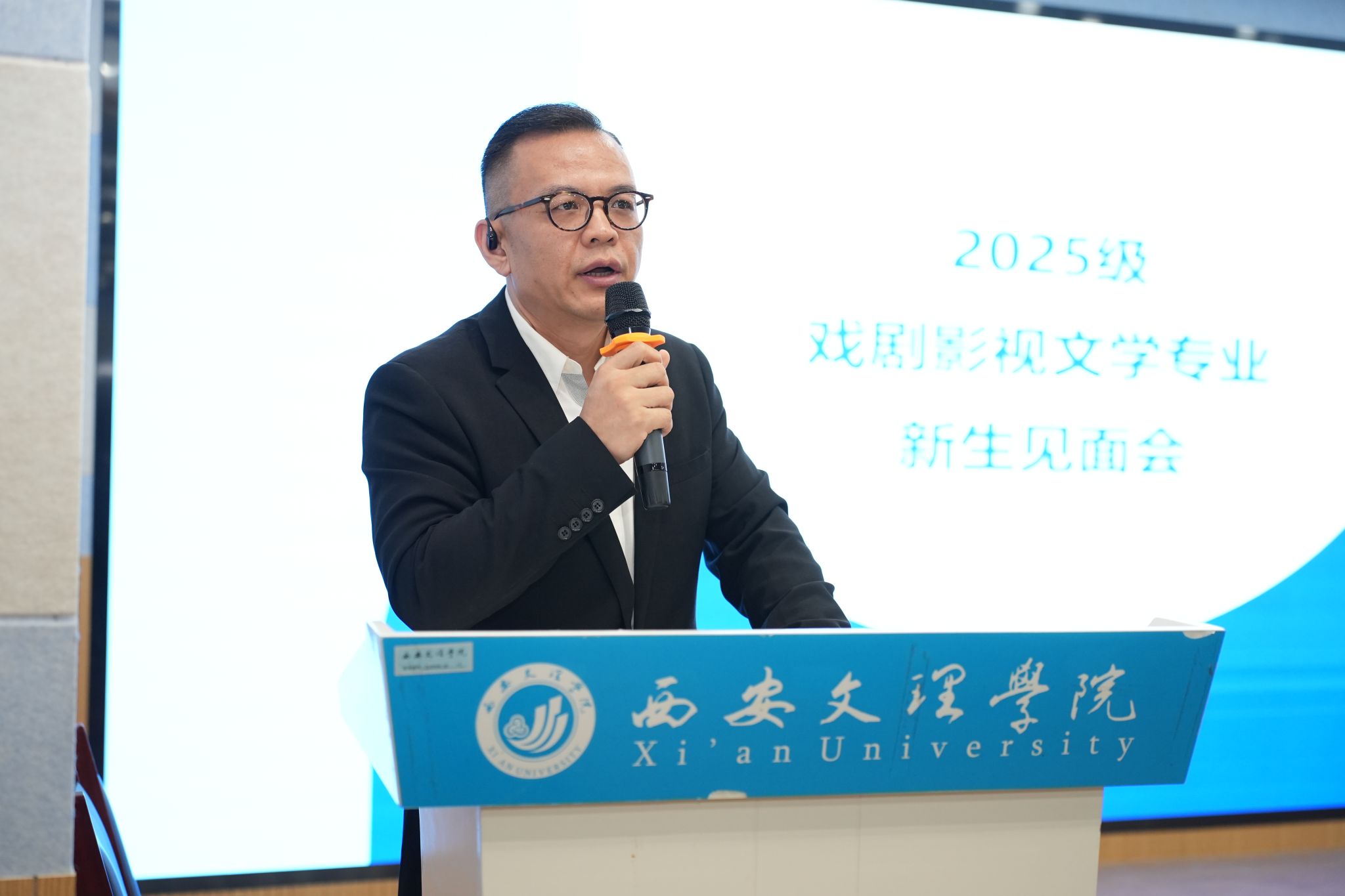 导学环节,袁晚晴系统讲解人才培养、课程体系、实践教学;马娜、李静、梁彬分别介绍舞台与呈现、影视媒介、新媒体三个“工作室”的培养路径与团队团队。交流环节,外聘行业导师高安林、刘茜文分别介绍了影视剧行业的前沿动态及AI创作的发展前景,鼓励新生在专业实践中锤炼真才实学、磨砺意志品质。