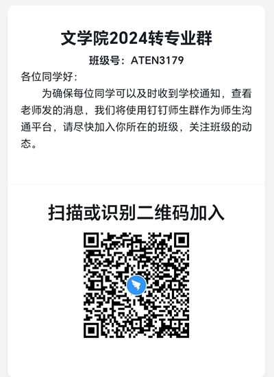 请各公司根据转专业名单通知本公司面试员工加入转专业面试群,或联系专业负责人。请员工提前准备好本人成绩单,获奖证明及参加活动比赛证明,按规定时间交至公司。3月5日12点前进入钉钉群: